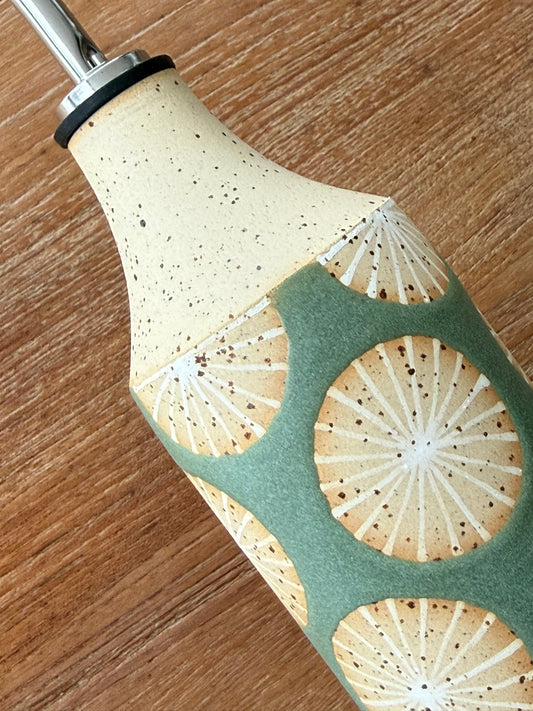 Oil bottle, green teardrops