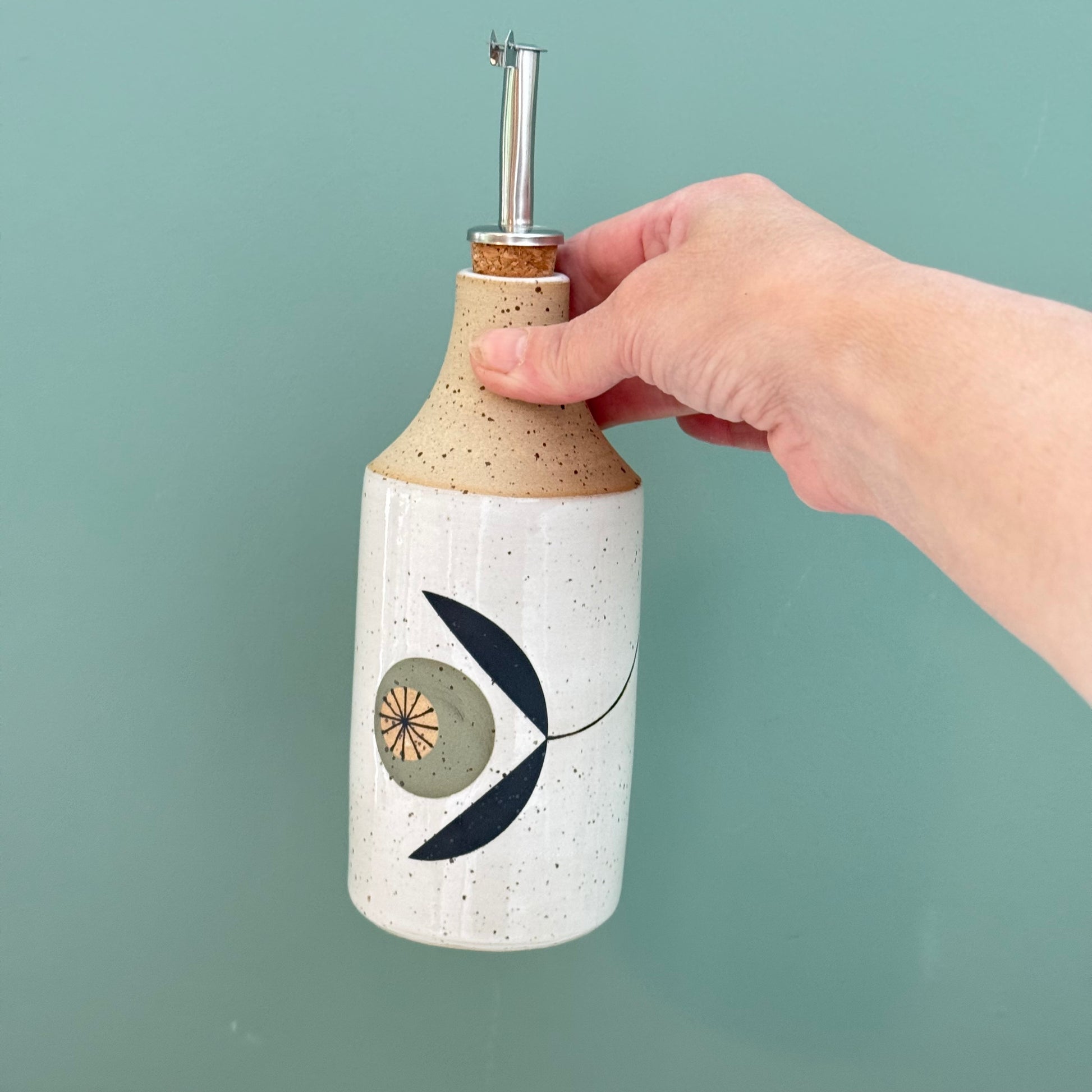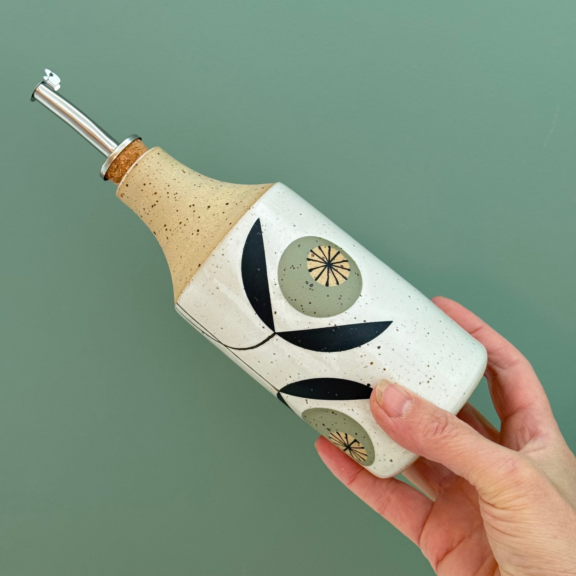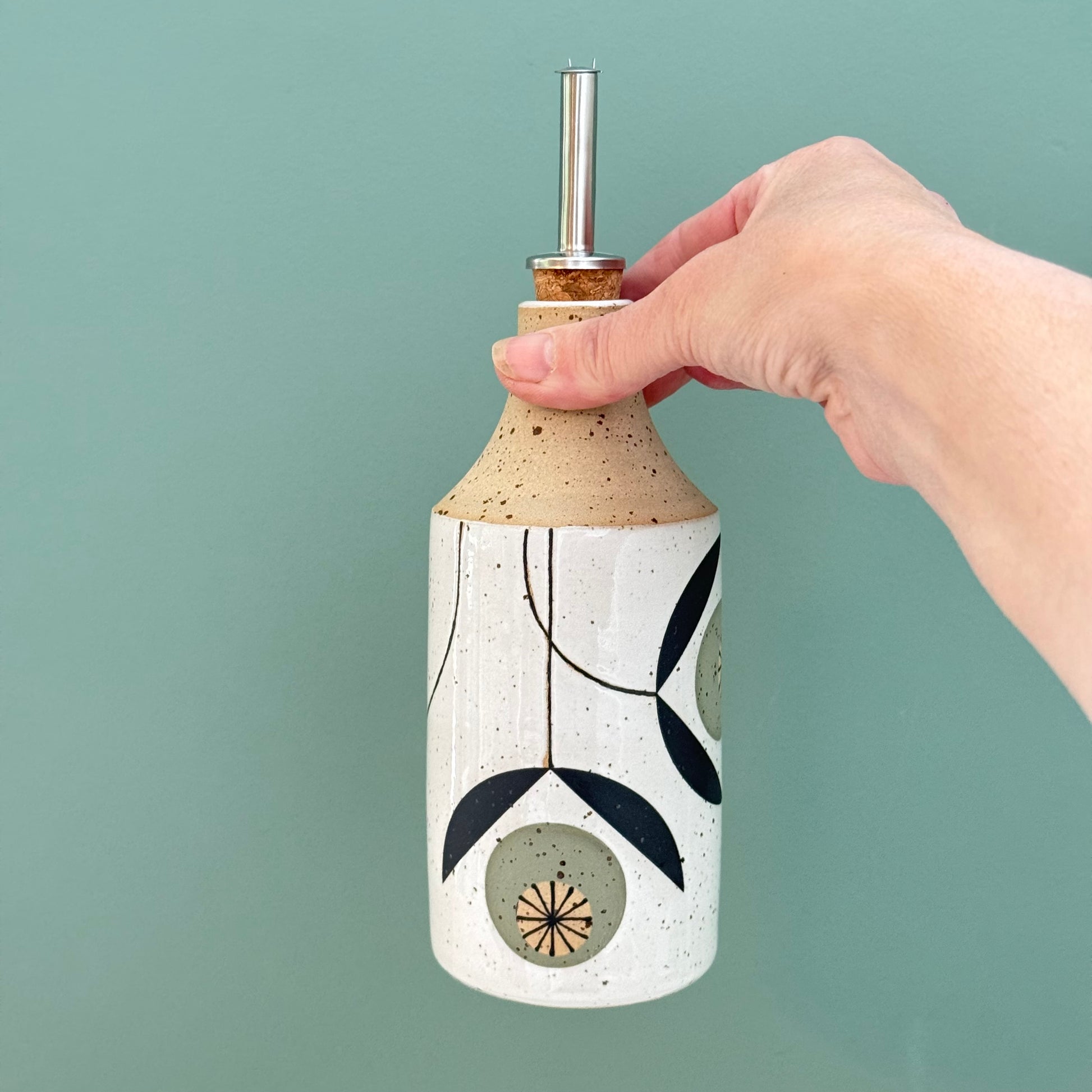 Handmade oil bottle, made from a light speckled stoneware clay and glazed in white. Hand decorated in a flower pattern using black, white and sage green underglaze on exposed clay. Glazed white on the inside.