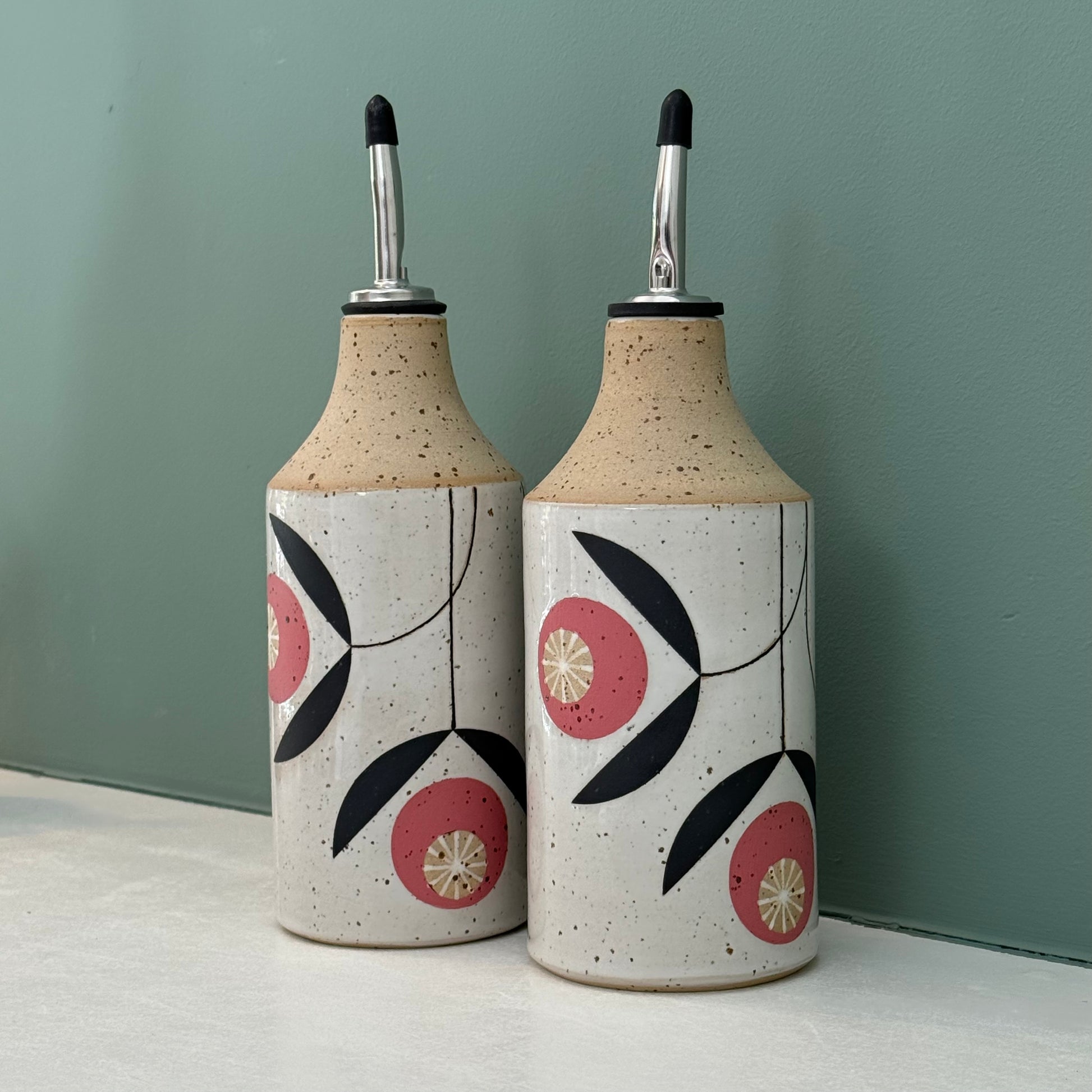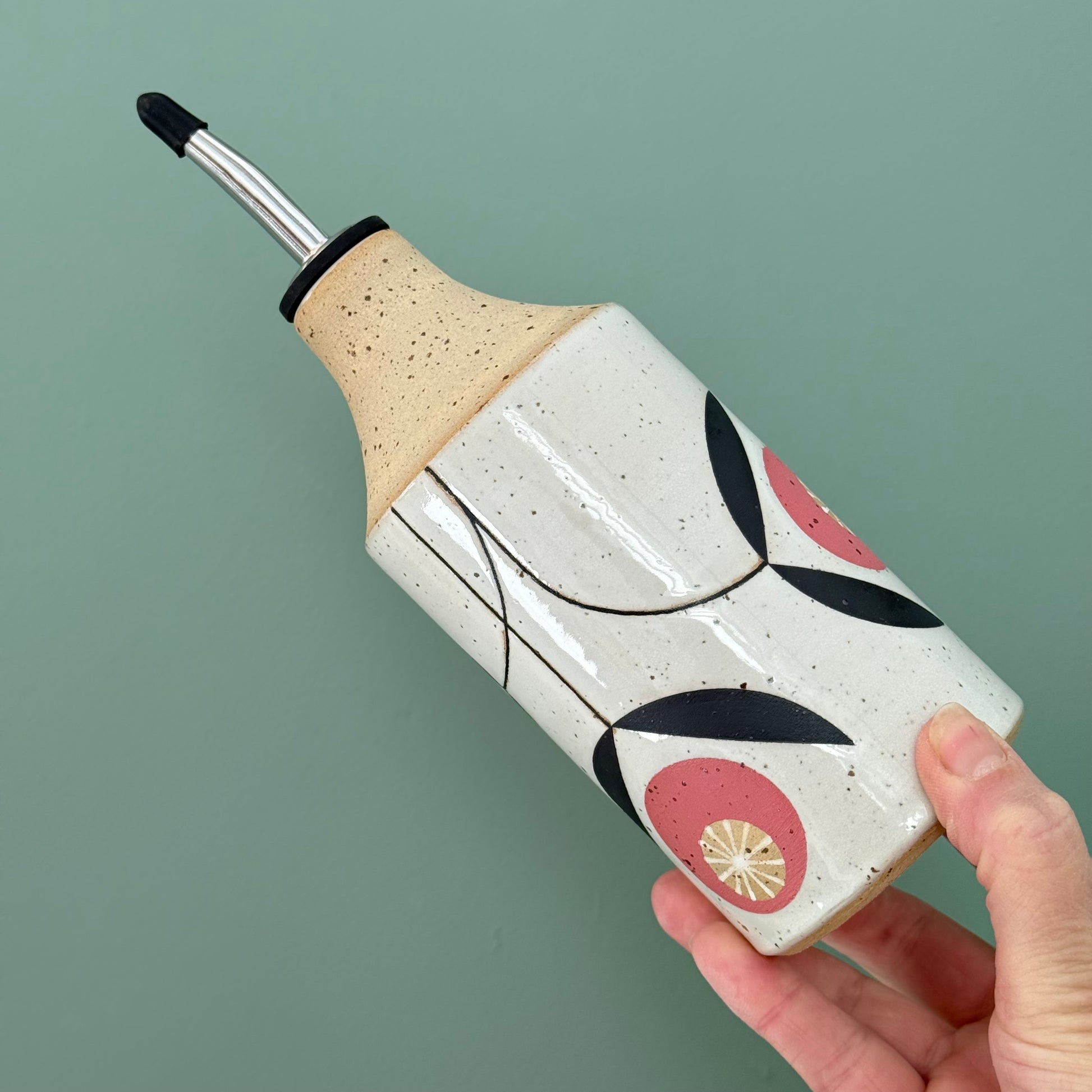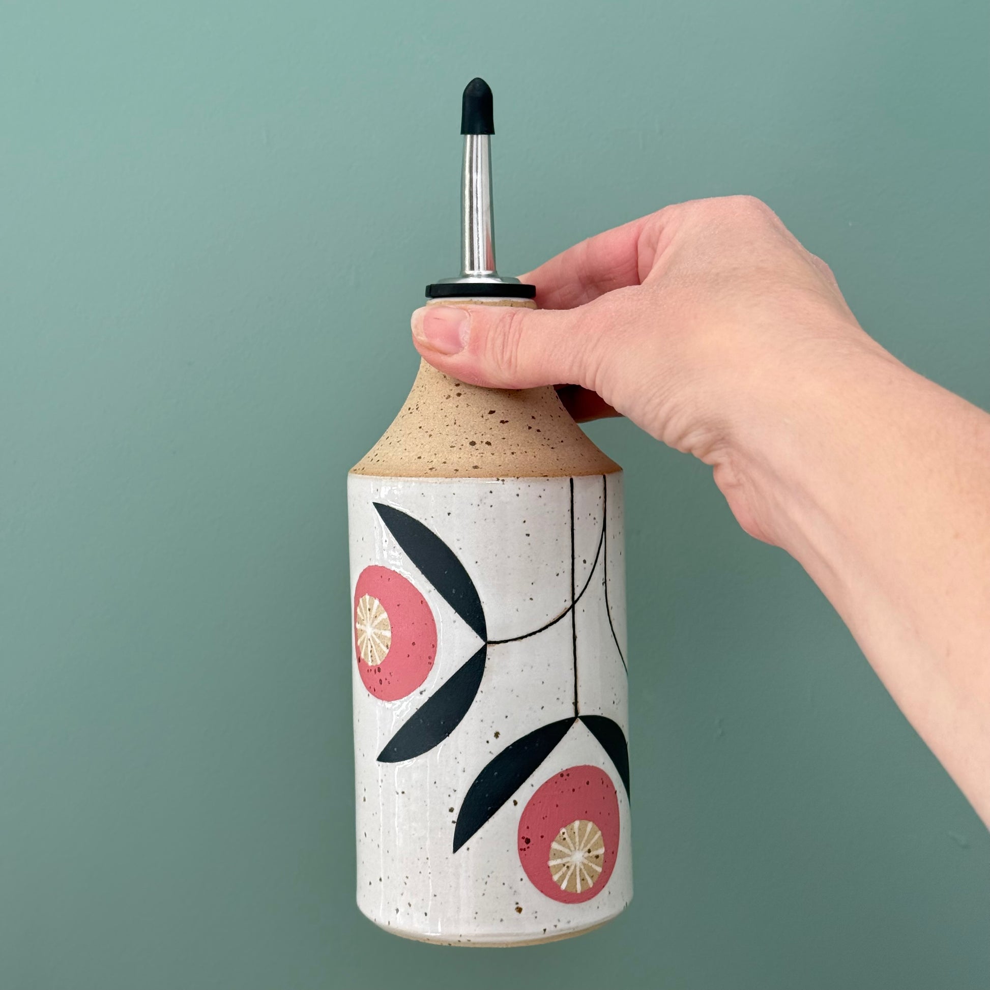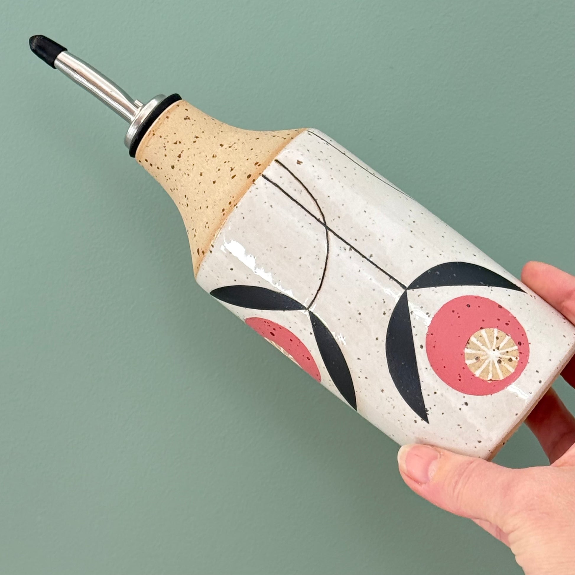 Handmade oil bottle, made from a light speckled stoneware clay and glazed in white. Hand decorated in a flower pattern using black, white and coral red underglaze on exposed clay. Glazed white on the inside.