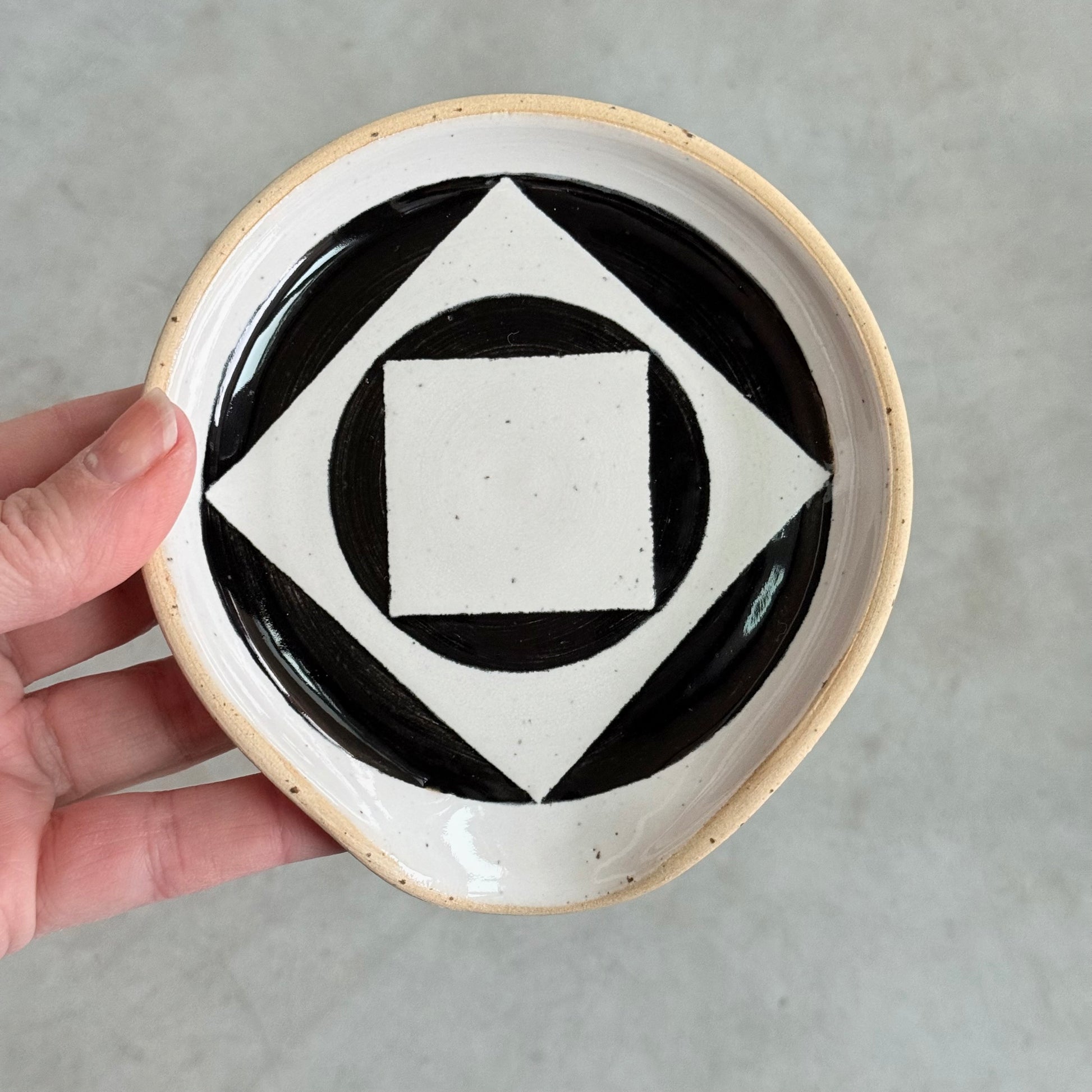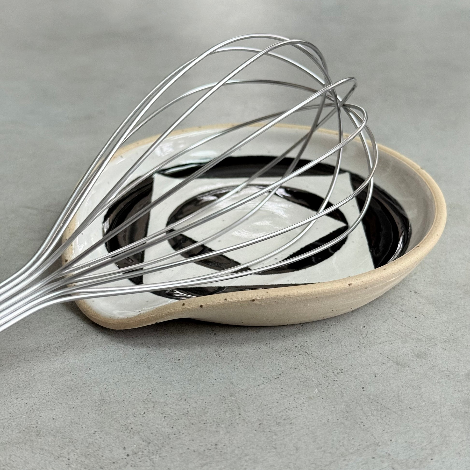 Spoon rest made from a lightly speckled recycled stoneware, glazed in white. Wheel thrown and altered to accomodate for a kitchen utensil. The surface is decorated with a geometric pattern using black glaze, the rim is left bare clay.