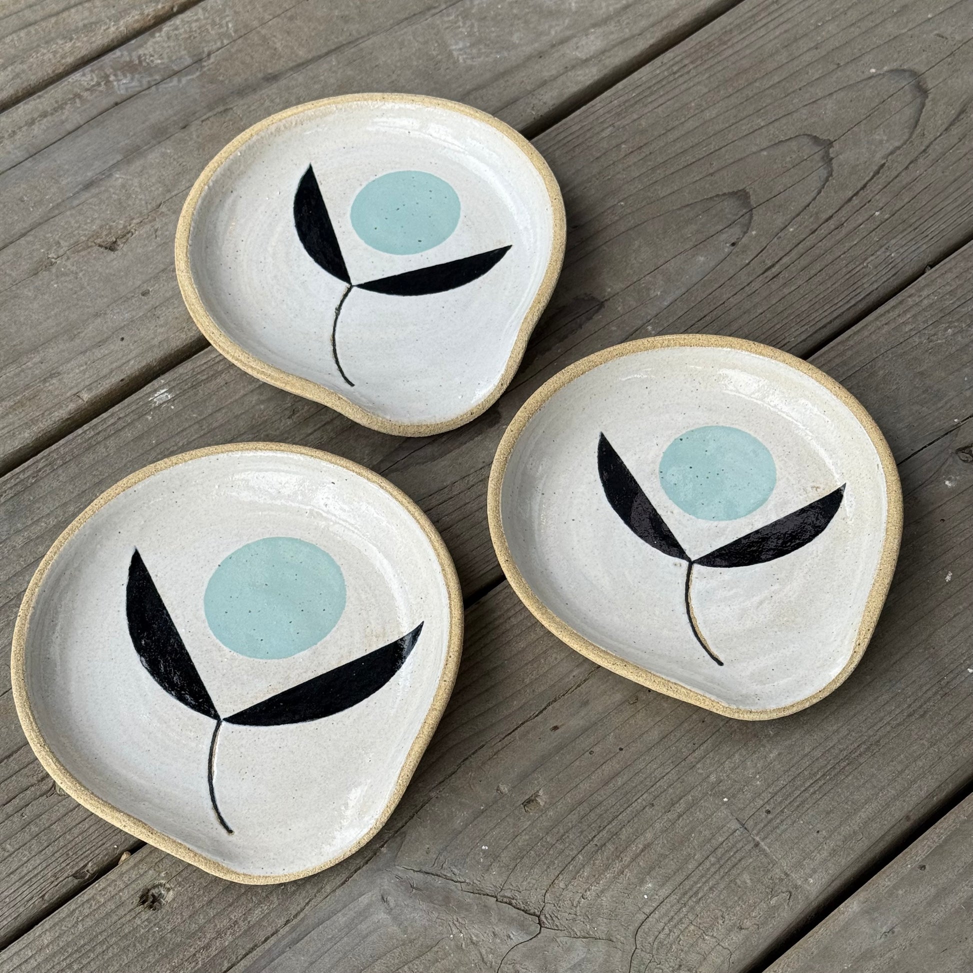 Spoon rest made from a recycled stoneware clay, glazed in white. Wheel thrown and altered to accomodate for a kitchen utensil. The surface is decorated with a stylized floral design using dark black and light blue glazes. The rim is left bare clay.