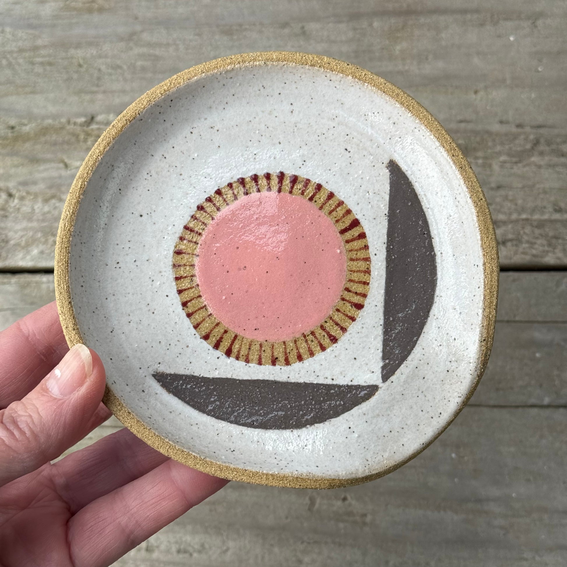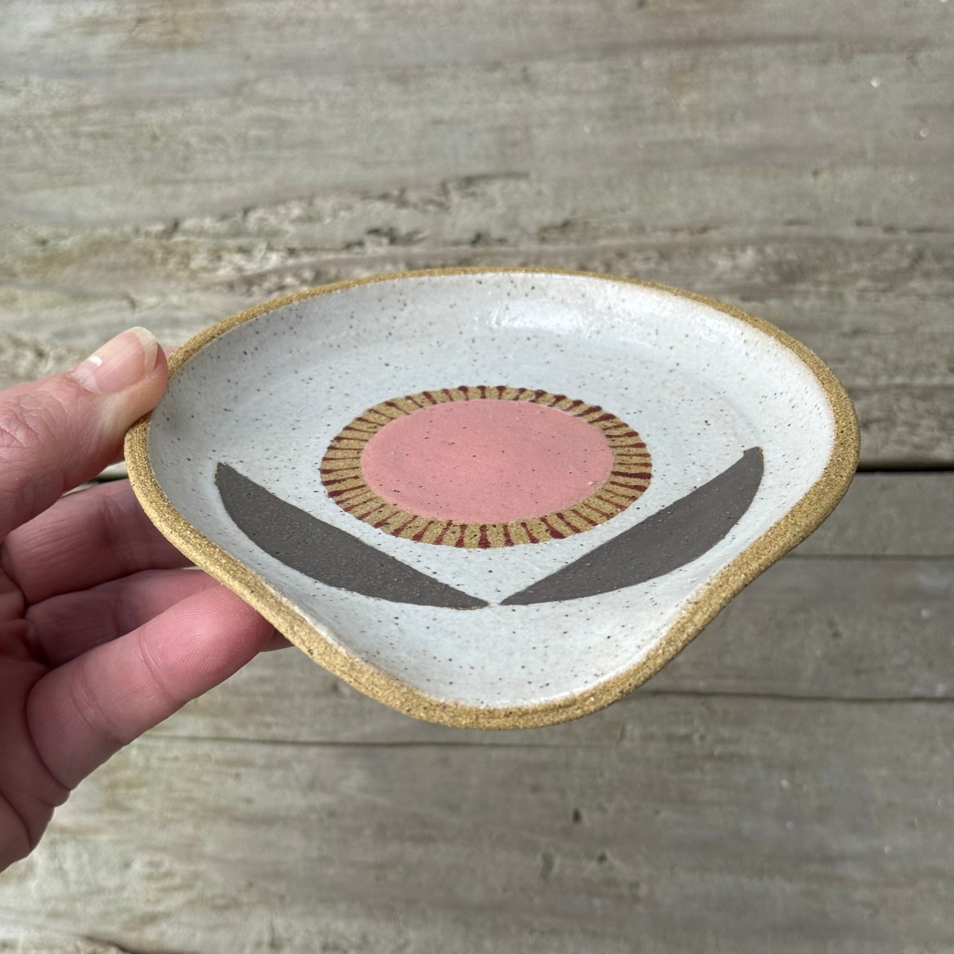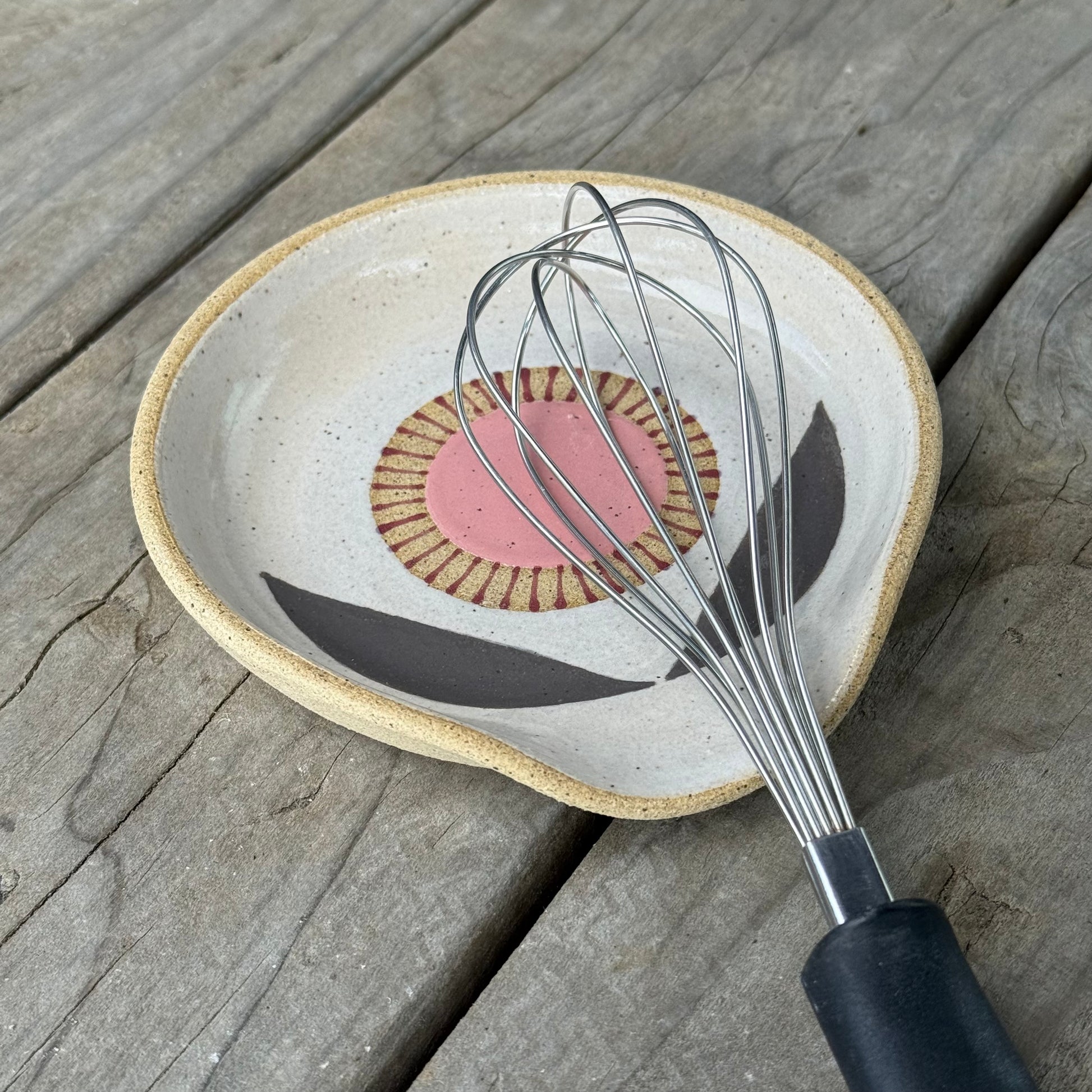 Spoon rest made from a recycled stoneware clay, glazed in white. Wheel thrown and altered to accomodate for a kitchen utensil. The surface is decorated with a floral pattern using pink, burgundy and taupe glazes. The rim is left bare clay.